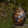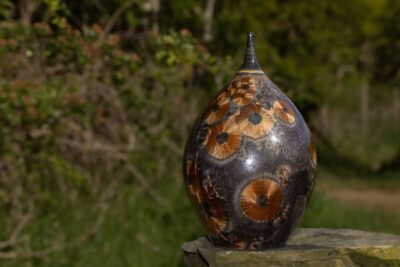 The outcomes of each urn are unique due to the formation of the crystals during firing. The quality of the crystals formed are exceptionally vivid and shimmer-like holograms as they catch the sunlight.