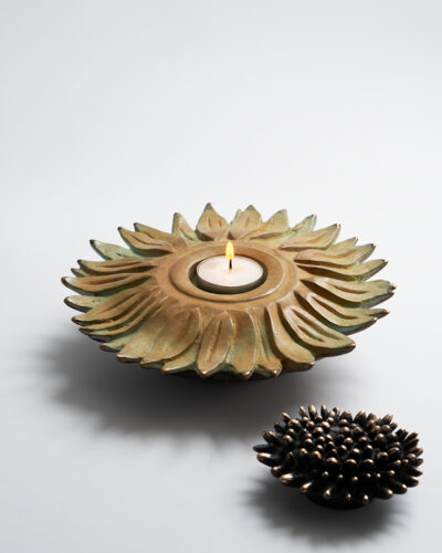 ‘The Sunflower’ is made of the timeless material bronze, which has an eternal value and is suitable to be placed both indoors and outdoors. If desired, a text can be engraved in the urn. For example, the name of your loved one. It is possible to place a candle in the top of the urn or to close this space with a bronze plate.