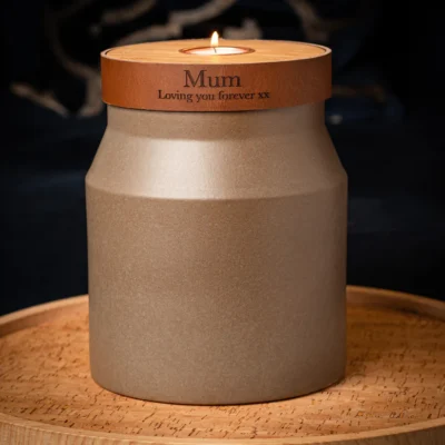 The Modern Rustic Urn offers a beautiful way to honour a loved one. Each piece is handmade, giving it a naturally soft texture and a refined presence that feels at home in any interior. Available in two timeless tones — Forest Grey and Slate Grey — the urn is finished with a warm cognac-brown leather band and matching lid detail, bringing a subtle, handcrafted warmth to the design. This urn includes a tealight holder lid, allowing families to create a softly glowing moment of remembrance